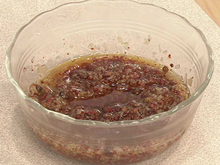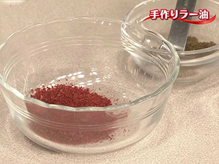ラー油の唐辛子と山椒は水にふやかして辛みと赤みをひき出します。