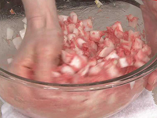 玉ねぎは存在感が残るように1cm角に大きめに切る。ひき肉と卵などの材料をよく混ぜて粘りを出し、それから玉ねぎを混ぜるとしっかりまとまる。