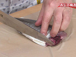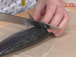 (1) あじは新聞紙などの上にのせ、胸ビレのつけ根に斜めに包丁を入れて中骨まで切り、反対側からも包丁を入れて頭を切り落とす。