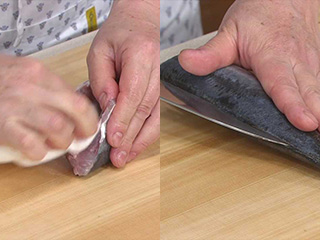 (8) 頭側の背の部分の皮を指先でこそげてとっかかりをつけ、尾側に向けて皮を引く。身を斜めに細く引き切りにする。