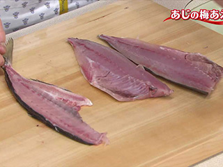(3) 水気をふいてまな板にのせ、腹側から中骨の上に沿って包丁を入れ、背側からも中骨の上に沿って包丁を入れる。