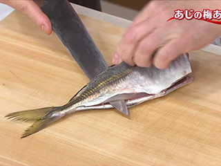 (4) 尾のつけ根の中骨の上に包丁を刺し込んで貫通させ、頭側に包丁を引いて切り、尾のつけ根を切って身をはずす(二枚おろし)。