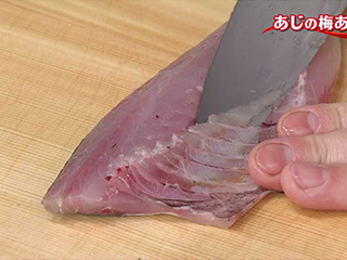 (7) 腹骨の際に包丁を寝かせて入れてすきとり、そのまま包丁を立てて端を切り落とす。小骨を骨抜きで頭のほうに引いて抜く。