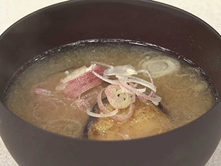 なすは輪切りにして油少々熱したフライパンで焼きつけお椀に適量入れ、温めたみそ汁を注ぎ、みょうがの小口切りを散らす。