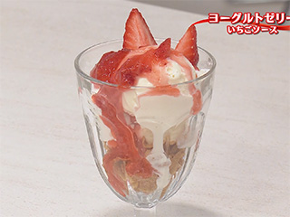 グラスにコーンフレーク(またはカステラでもOK)、バニラアイス、いちごソースを順に重ね入れ、生クリームを絞り、半分に切ったいちごを飾る
