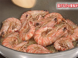 えびは尾と剣先を落として水気をしごき出すことを忘れずに!さらによく洗って完全に拭き取ってから揚げ始めること(ハネないようにふたなどでガードを)。