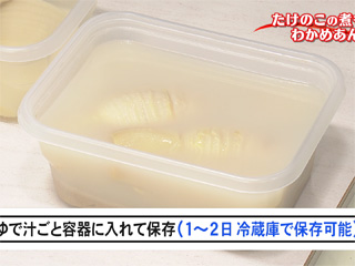 保存する場合は、清潔な保存容器に(2)をゆで汁ごと入れる。冷蔵庫で1~2日保存が可能。2日以上保存する場合は、洗って米ぬかを落とし、保存容器に入れてかぶるくらいの水を注ぐ。冷蔵庫で5日ほど保存が可能。