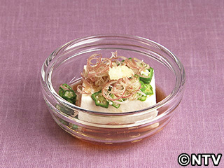 作り方 (1)めんつゆを作る。鍋にだし汁を中火で煮立て、みりんとしょうゆを加えてひと煮立ちさせ、火を止める。粗熱をとってから冷蔵庫で冷やす。 (2)オクラはヘタを切り、ガクのまわりをぐるりとむく。塩少々でもんで熱湯でゆで、ザルに上げる。冷水で冷まし、小口切りにする。みょうがも小口切りにする。 (3)豆腐は4等分に切って器に盛る。(2)としょうがをのせ、(1)のめんつゆを注ぐ。
