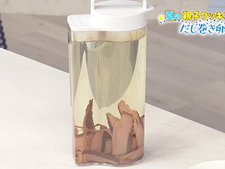 保存容器に、削りがつお、またはかつおの厚削り30gと水1.5ℓを入れ、冷蔵庫で一晩おく。冷蔵庫で2日保存が可能。だしをとったあとの削りがつおを水で煮出せば、二番だしとしても使える。
