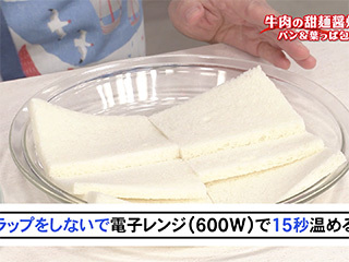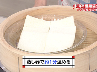 サンドイッチ用食パンは、蒸し器に並べてほんのり温まるまで1分ほど蒸す。または電子レンジで温めてもよい。