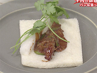 サンドイッチ用食パン、またはサニーレタスに牛肉の甜麺醤炒め、大根、香菜をのせて包んで食べる。