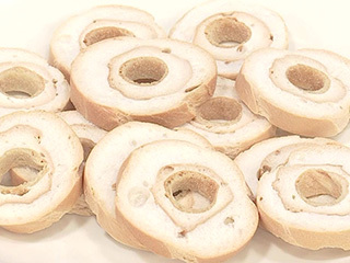 麩は小麦粉のたんぱく質、グルテンが主原料で、車麩は棒に生地を巻きつけて焼いたもの。今回は、小さめを使用。大きめを使用する場合は1人分1個を使用し、もどし時間が長いので注意する。