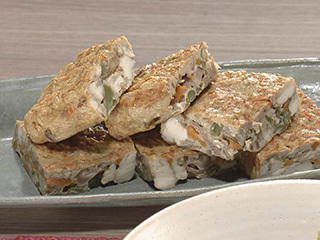 材料・作り方(作りやすい分量) 1:ボウルに卵3個を溶きほぐし、炒り豆腐1/3量(約200g)、塩少々を加えて混ぜる。 2:卵焼き器(12.5×17㎝)に油大さじ1を熱し、(1)を入れて半熟状になるまで混ぜ、ふたをして焼く。底面が固まり、表面が少し固まったら小さいまな板などに返してとり出し、滑らせて卵焼き器に戻し、弱火にして4分焼く。粗熱がとれたら、食べやすい大きさに切り分ける。 多めにできた炒り豆腐は、溶き卵に混ぜて焼き、ぎせい豆腐にリメークしても。早めに食べきりましょう。