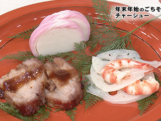 「チャーシュー」と「えびとれんこんの甘酢漬け」(12/26のレシピ参照)のほかに、かまぼこを飾り切りにした「手綱かまぼこ」を3種盛りにします。 朱漆の器に裏白などの縁起のよい葉を添えると、お正月らしさを演出できます。