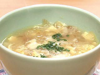材料・作り方(2人分) ① 鍋にオリーブ油大さじ1/2、玉ねぎの薄切り1/2個分(100g)を入れて火にかけ、薄いきつね色になるまで4~5分炒める。途中で焦げそうになったら弱火にする。 ② 水1+1/2カップ、洋風スープの素小さじ1/2、塩小さじ1/4、こしょう少々、衣に使ったパン粉の残り(約大さじ3)を加え、火を強めてひと煮立ちさせる。溶き卵1/2個分をまわし入れ、ふんわりと火を通す。 ③ 器に盛り、粉チーズ小さじ1をふり、あればパセリのみじん切り少々を散らす。 鶏メンチに使った溶き卵とパン粉の残りは、捨てずにスープに利用しましょう。パン粉がスープを吸ってとろみがつき、食べごたえも出ます。