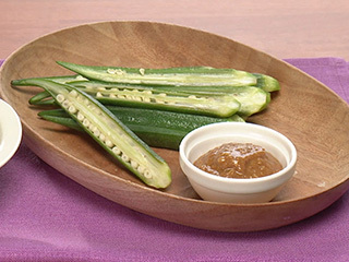 材料・作り方(2人分) オクラ8本(80g)はガクのまわりをぐるりとむく。塩少々を加えた熱湯でさっとゆで、水にとって冷ます。水気をふき、縦半分に切って器に盛り、辛子酢みそ(上記参照)半量を添えてつけながら食べる。