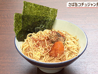 材料・作り方(1人分) ① さば缶コチュジャン煮(上記参照)の汁1/2カップ、さば缶コチュジャン煮の具適量、水1カップを鍋に入れて火にかけ、煮立ったらインスタントラーメン(味つけのないタイプ)1玉を加えて煮る。 ② めんが煮えたら卵1個を溶いてまわし入れ、ふたをして1分ほど煮る。器に盛り、焼きのり適量を添え、粉唐辛子(粗びき)少々をふる。