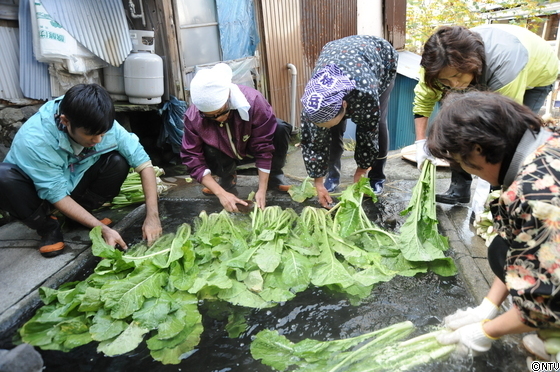 今回お世話になる、野沢菜漬け名人のトミーちゃんこと富井清子さんと、まずは野沢菜の収穫へ!