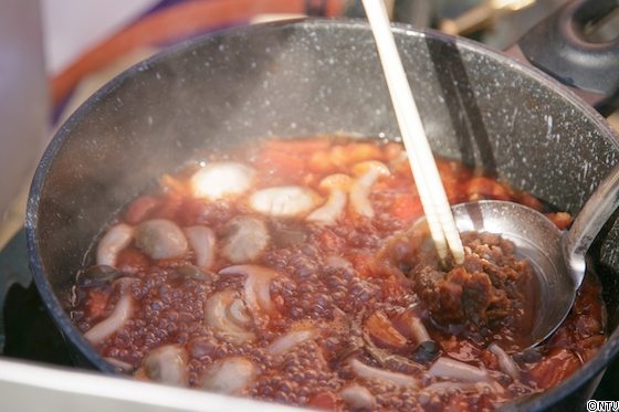 最後は、原木なめこと七味胡麻辣油を使って、マーボーなめこ丼で乾杯です