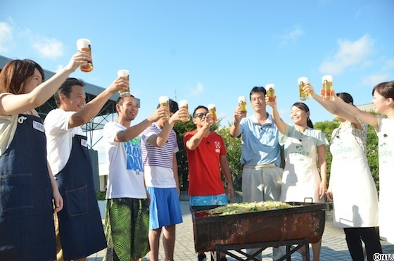 乾杯料理は、青空の下で海鮮塩焼きそば!