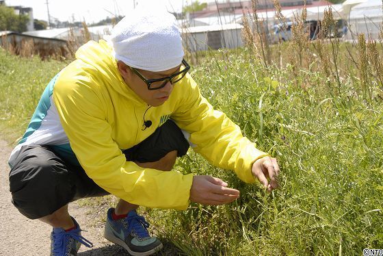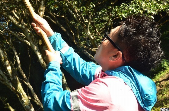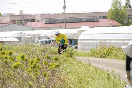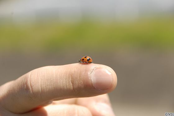 童心に帰って、夢中でてんとう虫を捕る大輔さんと金子さん。