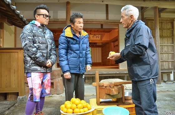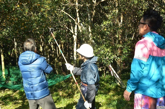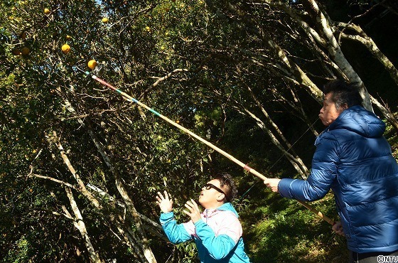 寛平さんがひっかけ落ちてくる柚子を下で待ち構えています。