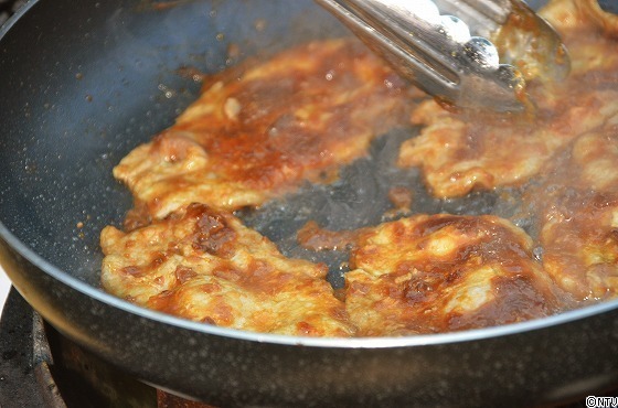 完成した柚子味噌を豚肉に塗り、焼きます!