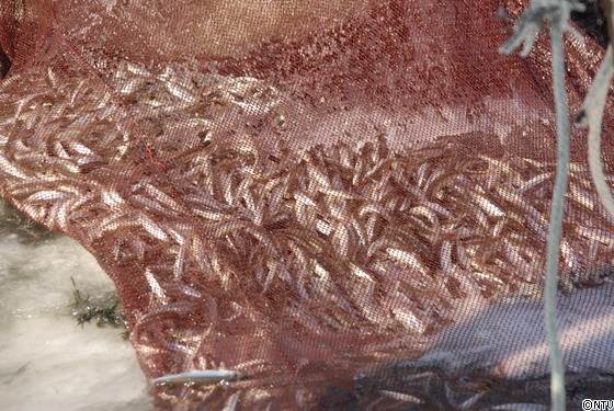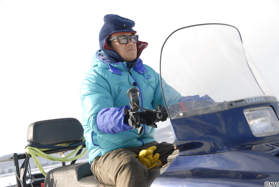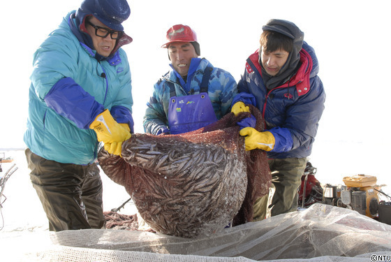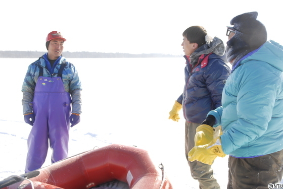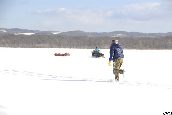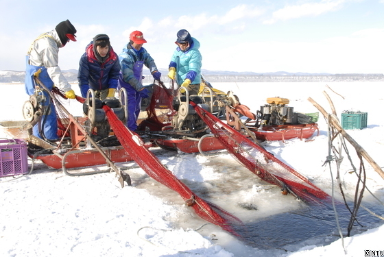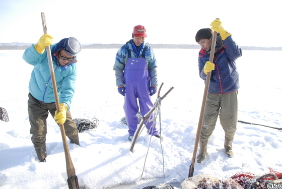 この氷の湖でわかさぎを獲る方法は、氷下引き網漁。