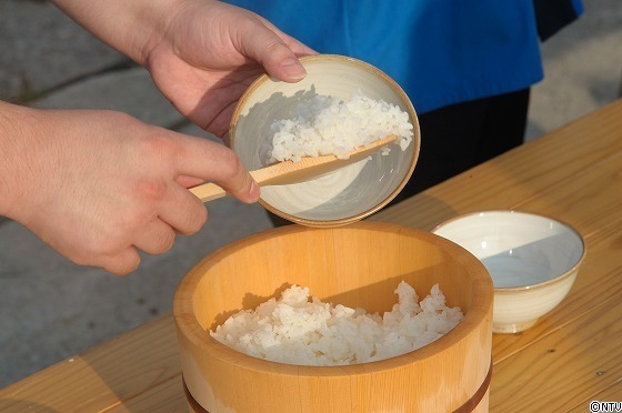 手のひらに乗るホッキ貝ごはん、量もちょうど良いと大絶賛!