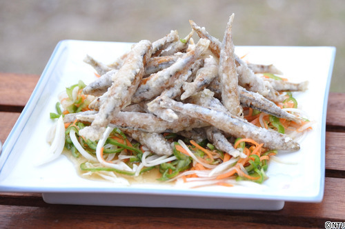 2、 薄く片栗粉をまぶし、170℃の油で揚げる