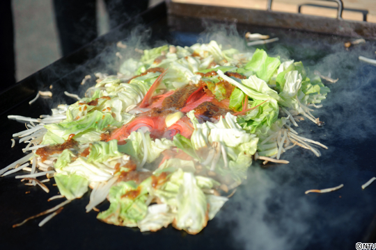 ⑤麺を広げ、上にキャベツを乗せて蓋のようにして蒸し上げる