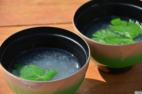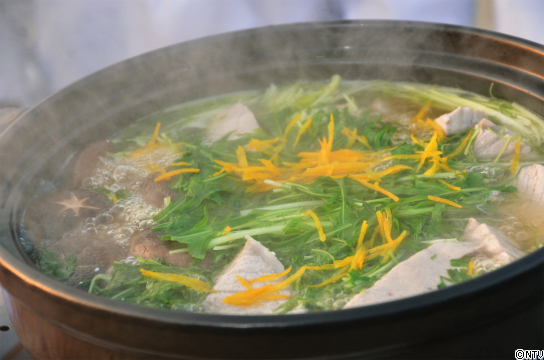 2. 土瓶に舞茸、ホッキ貝のヒモ、だし汁を入れ蒸し器で8分間蒸す。