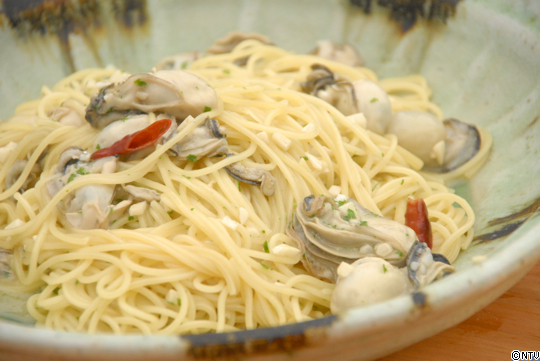 (4).牡蠣に通ったらバターとしょうゆで味付けし、パスタを入れてからめる