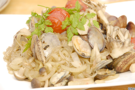 (4).牡蠣に通ったらバターとしょうゆで味付けし、パスタを入れてからめる