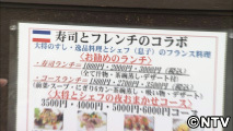 宮川さんは一軒のお店で足を止めました。店頭には「寿司とフレンチのコラボ」と書かれた看板があります。