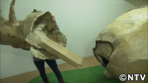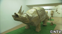 多摩美術大学で油絵を先行していた玉田さんは7年前に他ではやってないことをやりたいとダンボールアートを始めました。作り方は段ボールで土台を制作。その表面に水でぬらし1枚ずつはがしたダンボールを水で薄めたボンドで貼っていきます。その時にくしゃくしゃにすることで動物の皮膚感を出しています。サイや恐竜など大きな作品になると製作には2~3か月ほどかかるそうです。大きな作品はパーツごとに作られています。