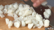 2.イカのゲソとフグの皮入りつみれをみじん切りで細かくする。