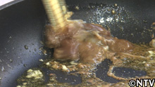 3.フライパンにオリーブオイルを引いて、みじん切りにしたニンニクと、イカのわたを入れて、弱火で炒める。