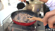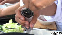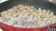 輪切りにしたタマネギの芽と一味唐辛子をふりかけ、キャベツと大根の葉を盛りつける。