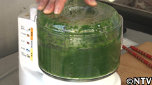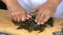 ワカメは収穫後、1日天日干しするが、乾燥することによって先端の古い部分の色が焼けた様に薄くなってしまうので捨ててしまう。