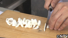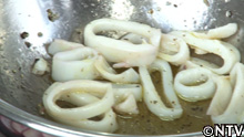 2.ケンサキイカを中火で茹でて、輪切りにする。
