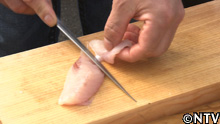 1.内臓を取り除き、身と皮を剥がす。切り身の部分をお刺身よりも少し厚く切っていく。