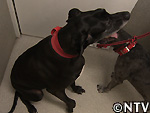 いつものように東京の街を散歩するジュンジュン。右の関節の所にピンポン玉ぐらいのこぶが出来、少し前足が辛そうでした。少し前まで、元気よく登っていた階段も今は登ろうとしません。 |