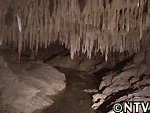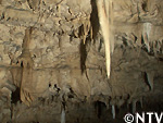 一般に、鍾乳石は茶色いが、鉄分を含む水の影響を受けなければ本来は白く透明な鍾乳石がたれ下がる。