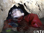 いよいよ、最大の難所。水面から25センチ、幅40センチの狭き穴。ガイドの大岡さんに習い、ヘルメットが邪魔にならないように外し、水面からかろうじて顔を出して呼吸し、顔半分を水につけながら慎重にくぐり抜ける。 |