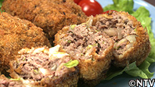 白菜を肉と野菜を混ぜたものを、小麦粉とパン粉にまぶして揚げた
