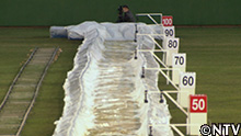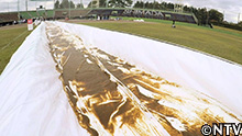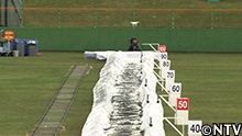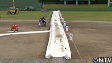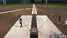 プロ野球の雨天中止の際、シートに溜まった水の上を滑るファンサービス。