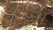 巣箱に直射日光が当たらないように、新男米のワラを束ねてかけていく。