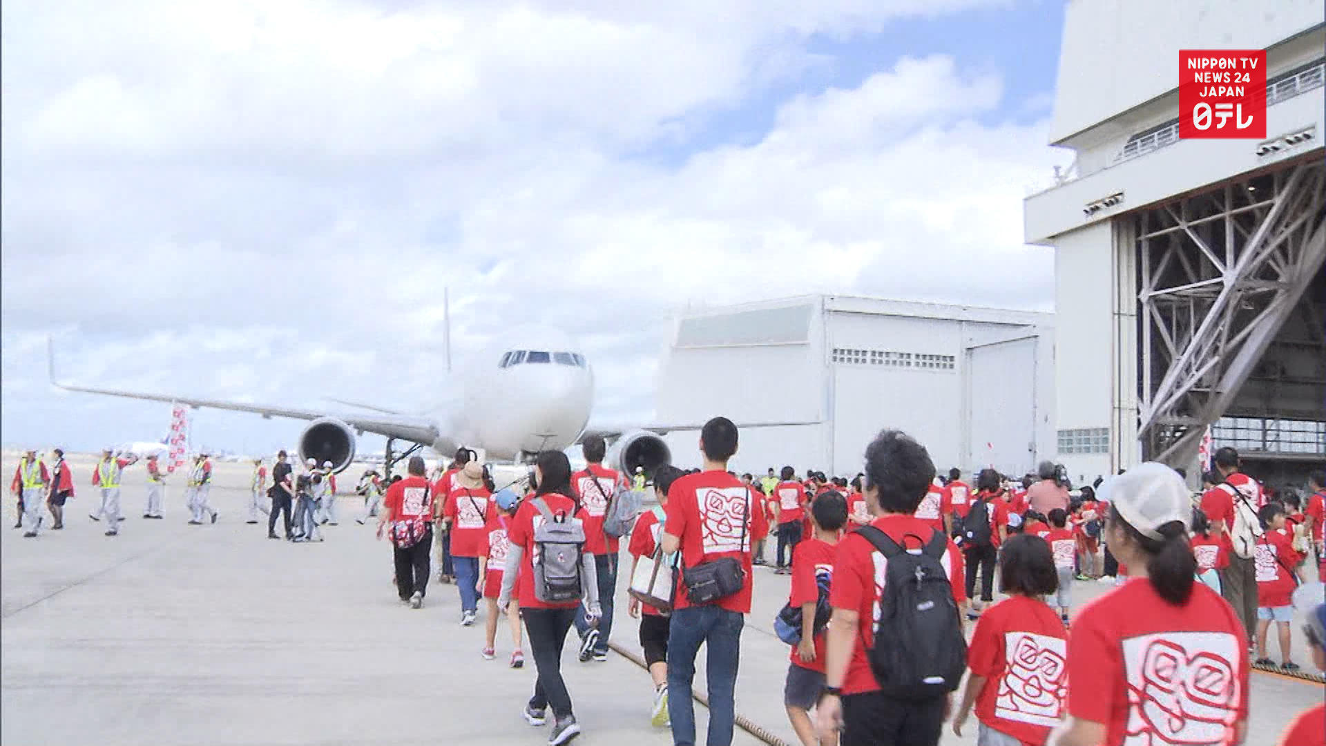 Children take part in a tug-of-war with a plane at Narita Airport.