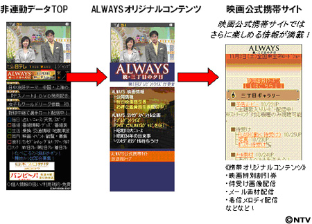 今回、日本テレビではALWAYS 続・三丁目の夕日の公開に伴い、ワンセグを活用した下記のプロモーションを実施いたします。
